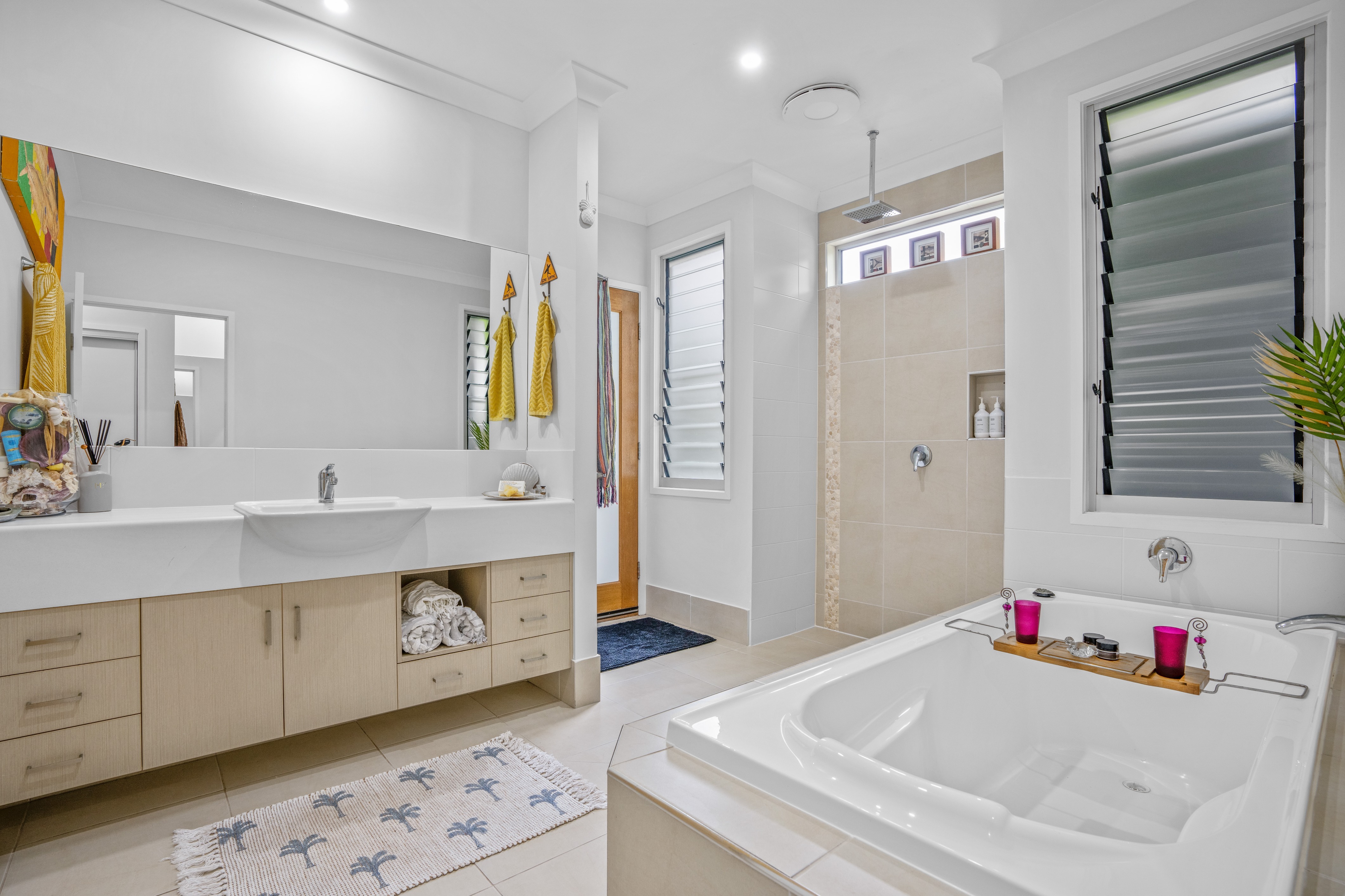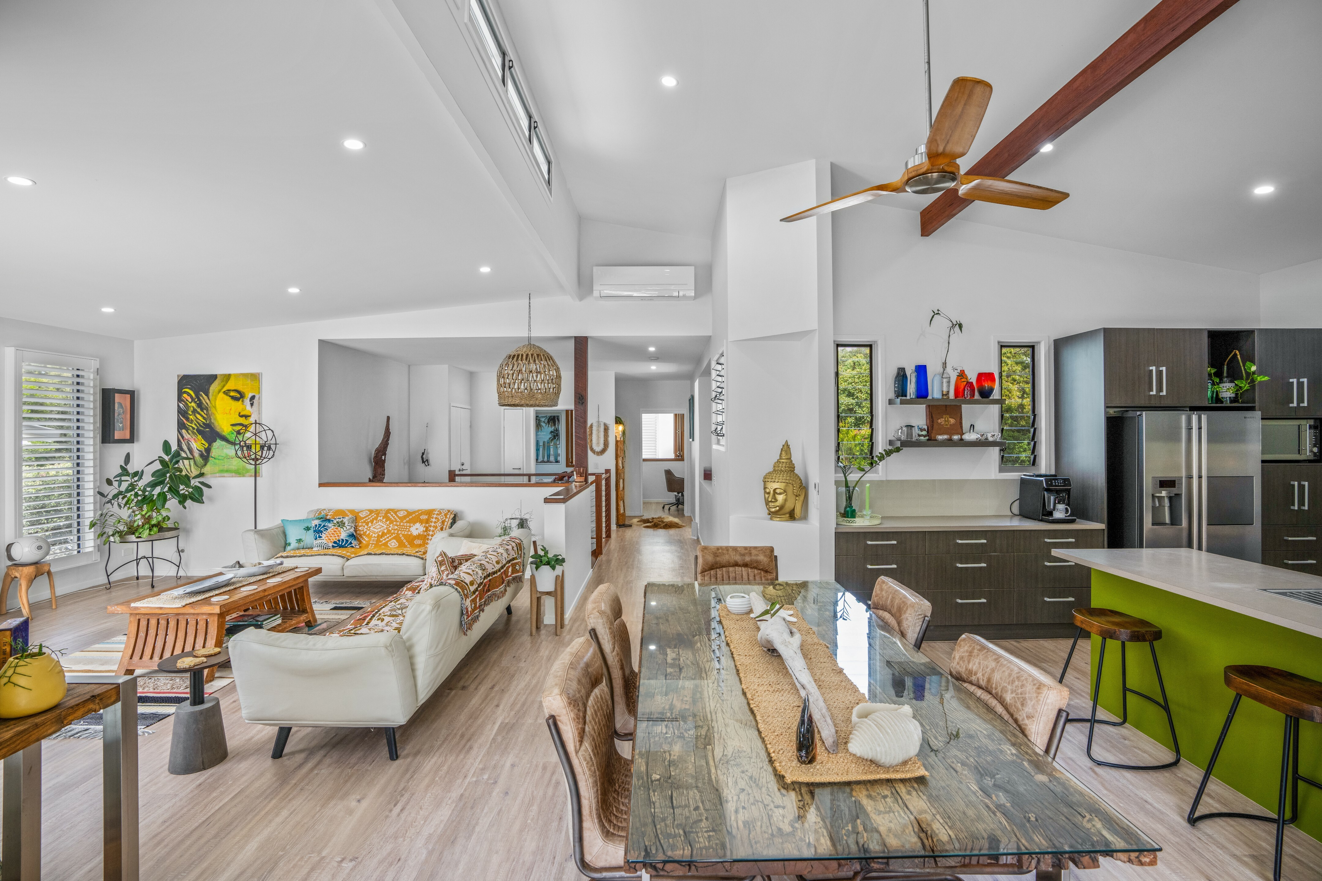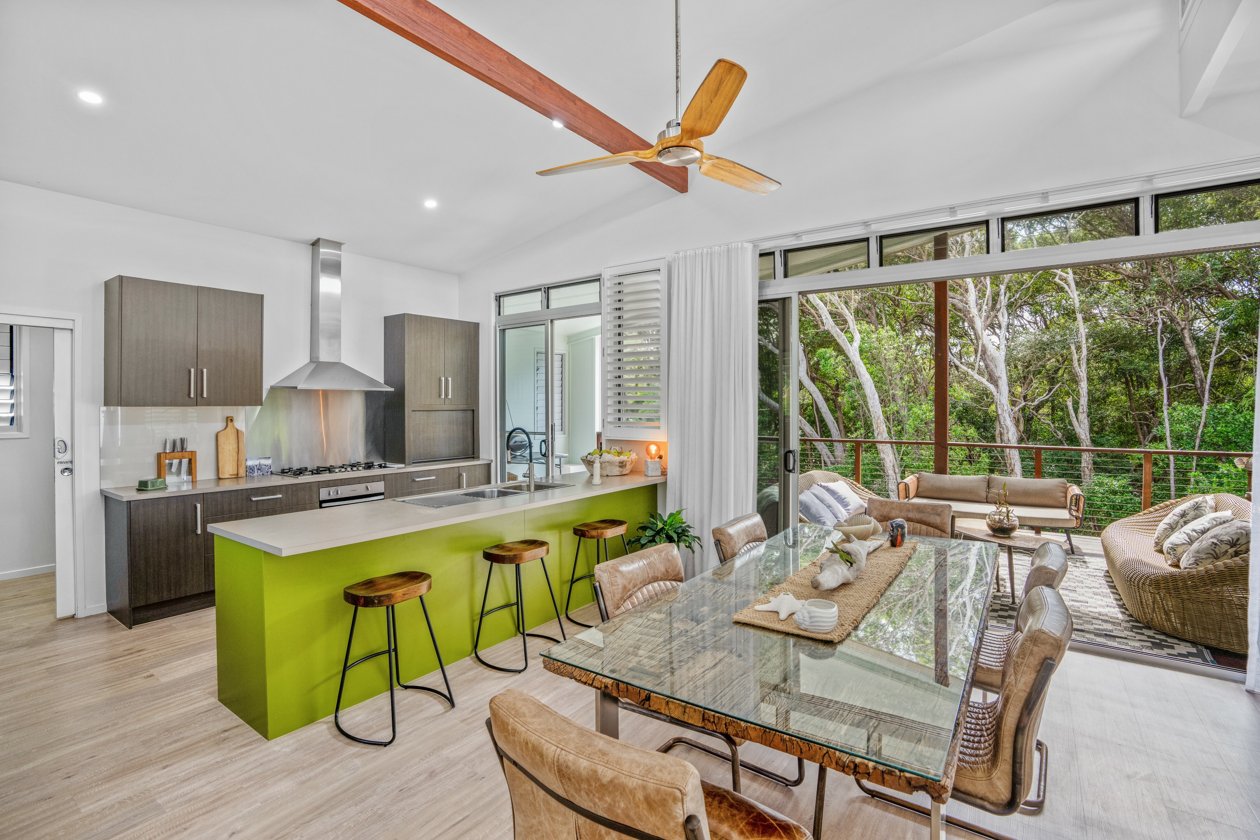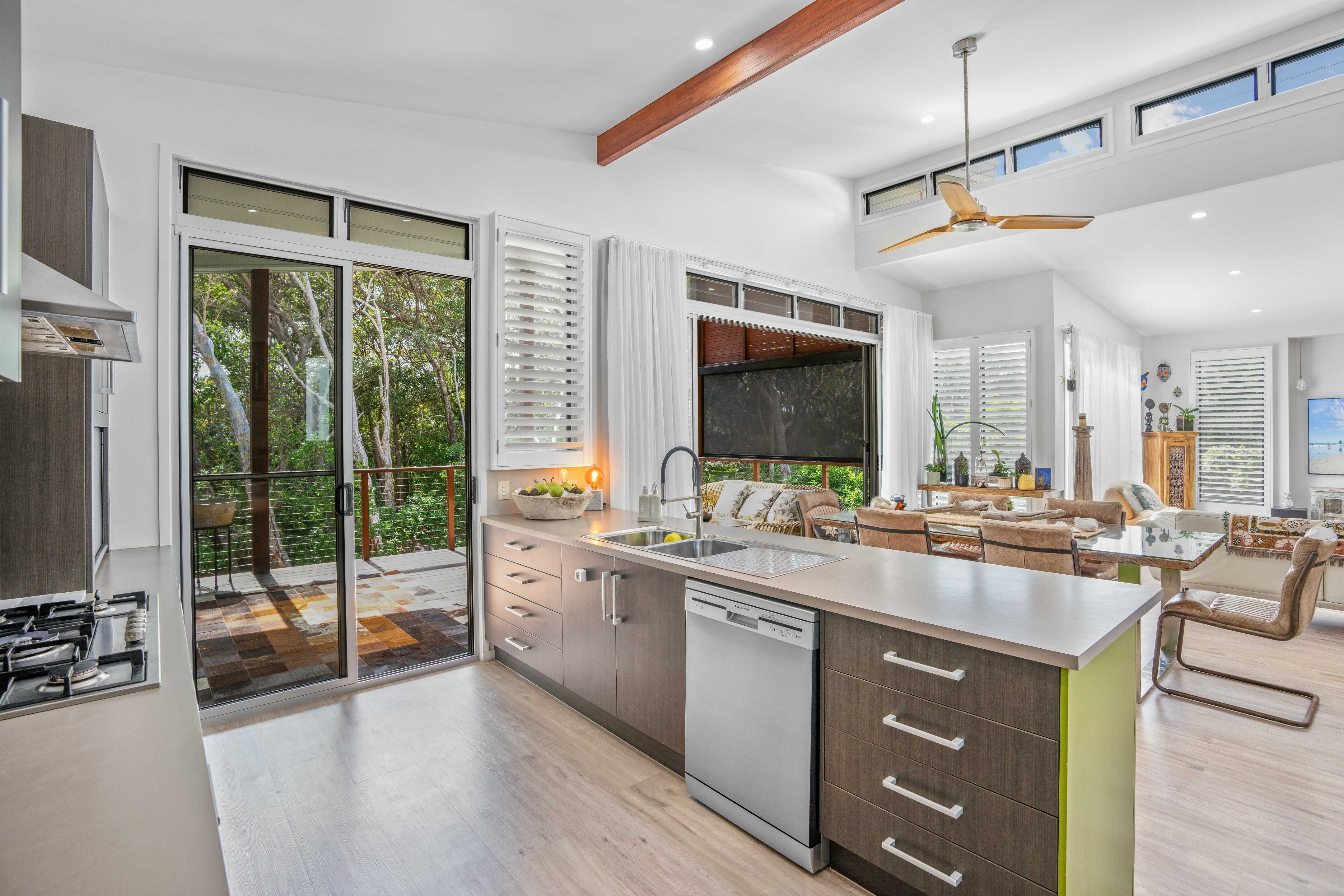 Refined coastal living, Executive beach house Beautifully presented and situated just metres away from the stunning Rainbow Beach. Only a few minutes' walk via a bush track to the shoreline, you can enjoy the best of beachside living here.